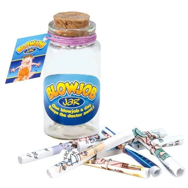 The Blow Job Jar is a great gift for the newly weds! Give the Groom or the Bride to Be and it will be a win win. A fun party favor for the adult party guest at your next Bachelorette, Bachelor or adult party. There are also several items to complete the gift set. Check the Blow Job Kit, Blow Job Bib and BJ candy.Everyone knows “One Blow Job a Day Keeps the Doctor away!” The jar includes a weeks worth of blow jobs (7 days) with a different task for each day. Bachelorette Superstore has the best selection of bachelorette and bachelor party decorations, party attire, party games and more.Â